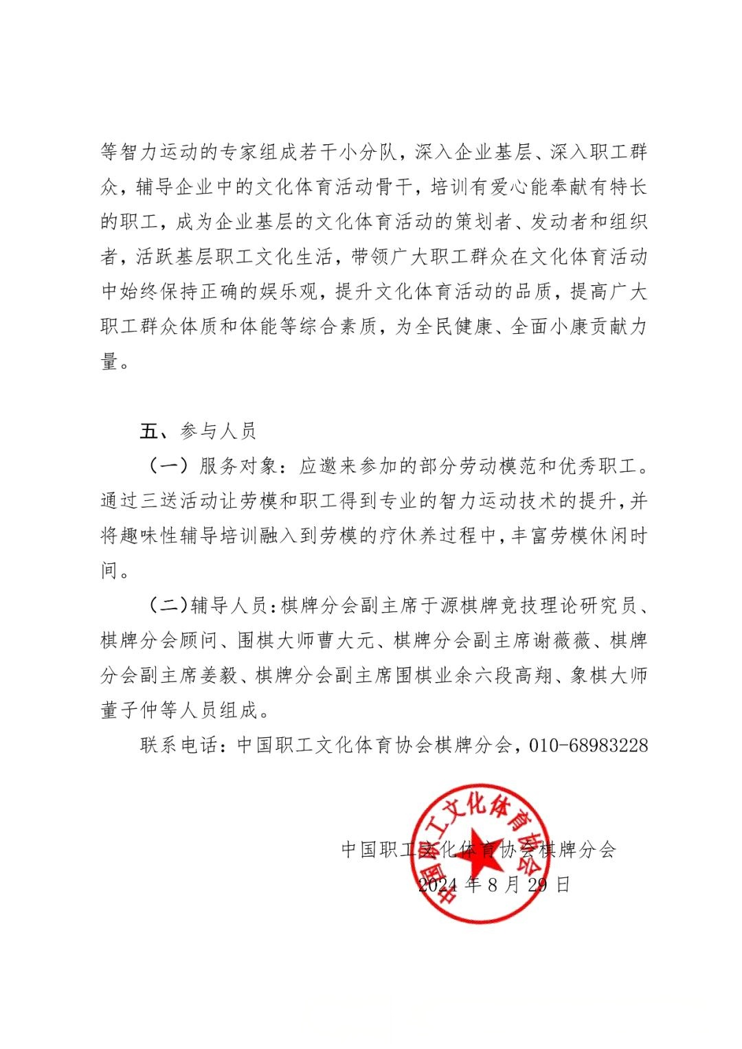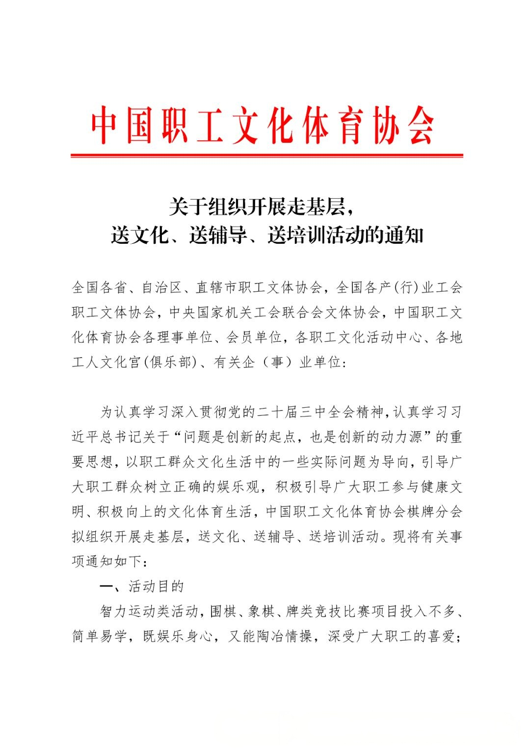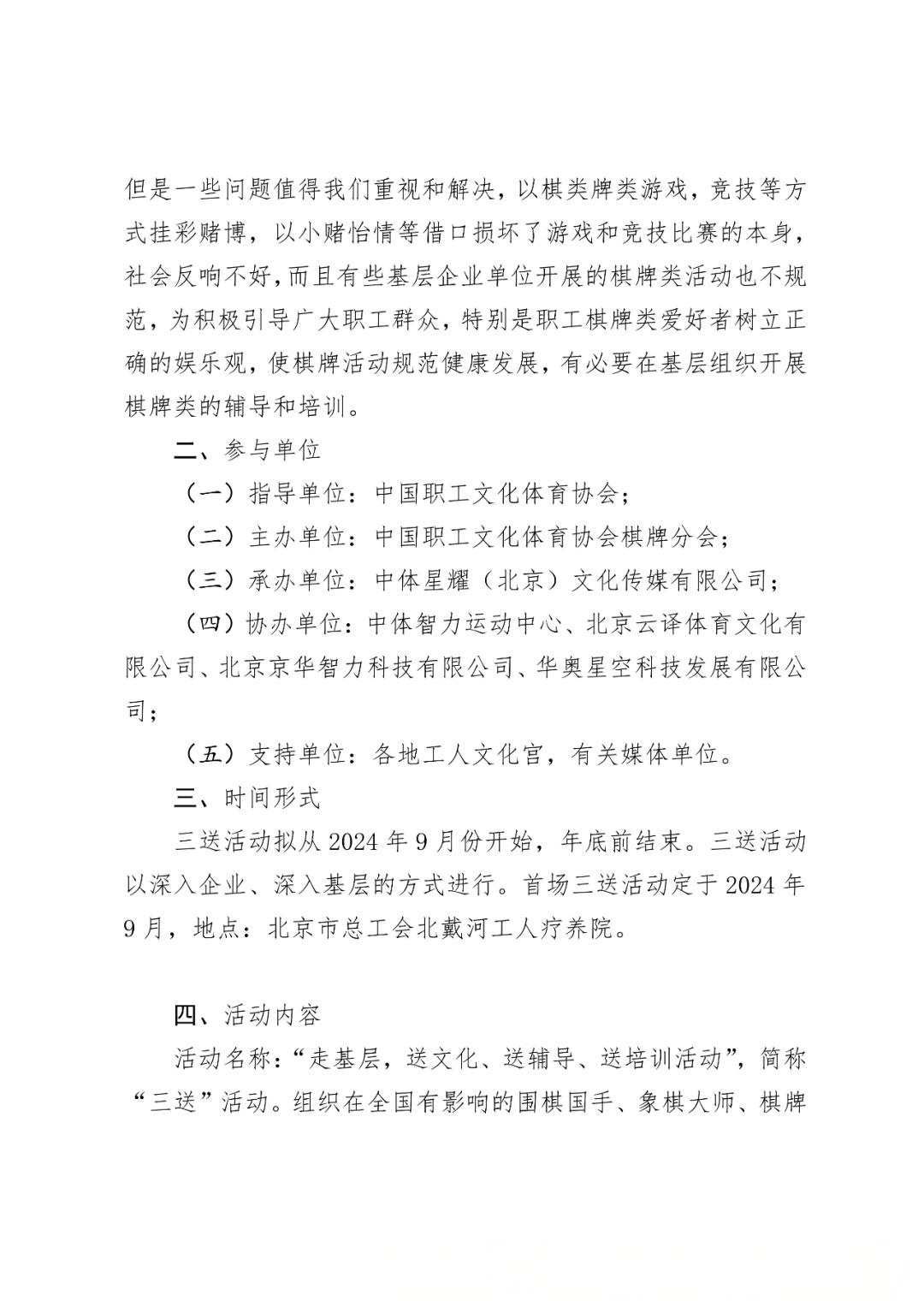 全国各省、自治区、直辖市职工文体协会,全国各产(行)业工会职工文体协会,中央国家机关工会联合会文体协会,中国职工文化体育协会各理事单位、会员单位,各职工文化活动中心、各地工人文化宫(俱乐部)、有关企(事)业单位:为认真学习深入贯彻党的二十届三中全会精神,认真学习习近平总书记关于“问题是创新的起点,也是创新的动力源”的重要思想,以职工群众文化生活中的一些实际问题为导向,引导广大职工群众树立正确的娱乐观,积极引导广大职工参与健康文明、积极向上的文化体育生活,中国职工文化体育协会棋牌分会拟组织开展走基层,送文化、送辅导、送培训活动。现将有关事项通知如下:智力运动类活动,围棋、象棋、牌类竞技比赛项目投入不多、简单易学,既娱乐身心,又能陶冶情操,深受广大职工的喜爱;但是一些问题值得我们重视和解决,以棋类牌类游戏,竞技等方式挂彩赌博,以小赌怡情等借口损坏了游戏和竞技比赛的本身,社会反响不好,而且有些基层企业单位开展的棋牌类活动也不规范,为积极引导广大职工群众,特别是职工棋牌类爱好者树立正确的娱乐观,使棋牌活动规范健康发展,有必要在基层组织开展棋牌类的辅导和培训。(三)承办单位:中体星耀(北京)文化传媒有限公司;(四)协办单位:中体智力运动中心、北京云译体育文化有限公司、北京京华智力科技有限公司、华奥星空科技发展有限公司;三送活动拟从2024年9月份开始,年底前结束。三送活动以深入企业、深入基层的方式进行。首场三送活动定于2024年9月,地点:北京市总工会北戴河工人疗养院。活动名称:“走基层,送文化、送辅导、送培训活动”,简称“三送”活动。组织在全国有影响的围棋国手、象棋大师、棋牌等智力运动的专家组成若干小分队,深入企业基层、深入职工群众,辅导企业中的文化体育活动骨干,培训有爱心能奉献有特长的职工,成为企业基层的文化体育活动的策划者、发动者和组织者,活跃基层职工文化生活,带领广大职工群众在文化体育活动中始终保持正确的娱乐观,提升文化体育活动的品质,提高广大职工群众体质和体能等综合素质,为全民健康、全面小康贡献力量。(一)服务对象:应邀来参加的部分劳动模范和优秀职工。通过三送活动让劳模和职工得到专业的智力运动技术的提升,并将趣味性辅导培训融入到劳模的疗休养过程中,丰富劳模休闲时间。(二)辅导人员:棋牌分会副主席于源棋牌竞技理论研究员、棋牌分会顾问、围棋大师曹大元、棋牌分会副主席谢薇薇、棋牌分会副主席姜毅、棋牌分会副主席围棋业余六段高翔、象棋大师董子仲等人员组成。联系电话:中国职工文化体育协会棋牌分会,010-68983228